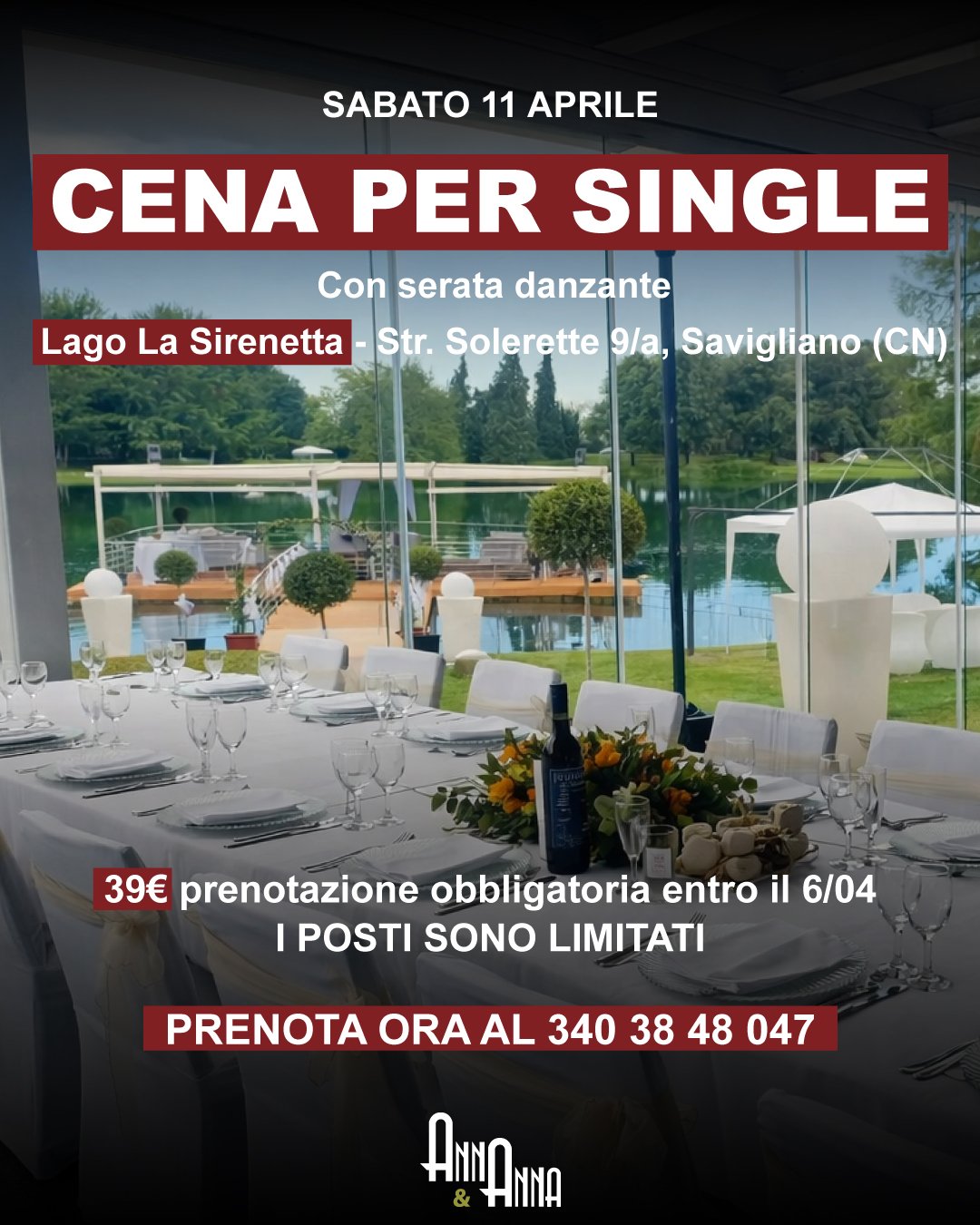 Partecipa alla Cena per Single Anna & Anna presso Lago La Sirenetta (Savigliano – CN).